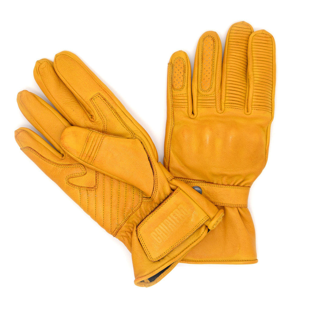 Questi guanti richiamano lo stile classico delle competizioni, ma offrono tutta la protezione necessaria per la guida quotidiana. La pelle bovina li rende resistenti, mentre la finitura cerata conferisce loro un look vintage. Gli inserti flessibili sulle dita e sul pollice facilitano i movimenti, mentre le protezioni nascoste in PU sulle nocche garantiscono sicurezza e discrezione. All'interno, una morbida fodera in poliestere assorbe l'umidità, assicurando il massimo comfort anche durante i viaggi più lunghi.