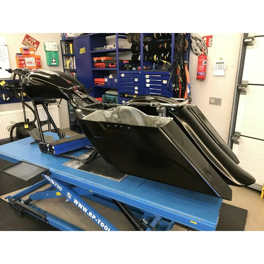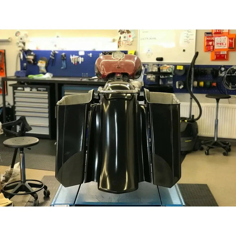 Questo kit di borse laterali e parafanghi trasforma la tua moto con un profilo allungato di 5" verso il basso e 7" lateralmente. Le borse laterali sostituiscono direttamente quelle di serie, offrendo spazio di stivaggio aggiuntivo e riutilizzando gli accessori e i coperchi esistenti. Sia le borse che i parafanghi sono preforati per una facile installazione e realizzati in fibra di vetro rivestita in gel nero posata a mano per garantire resistenza, rigidità e leggerezza.