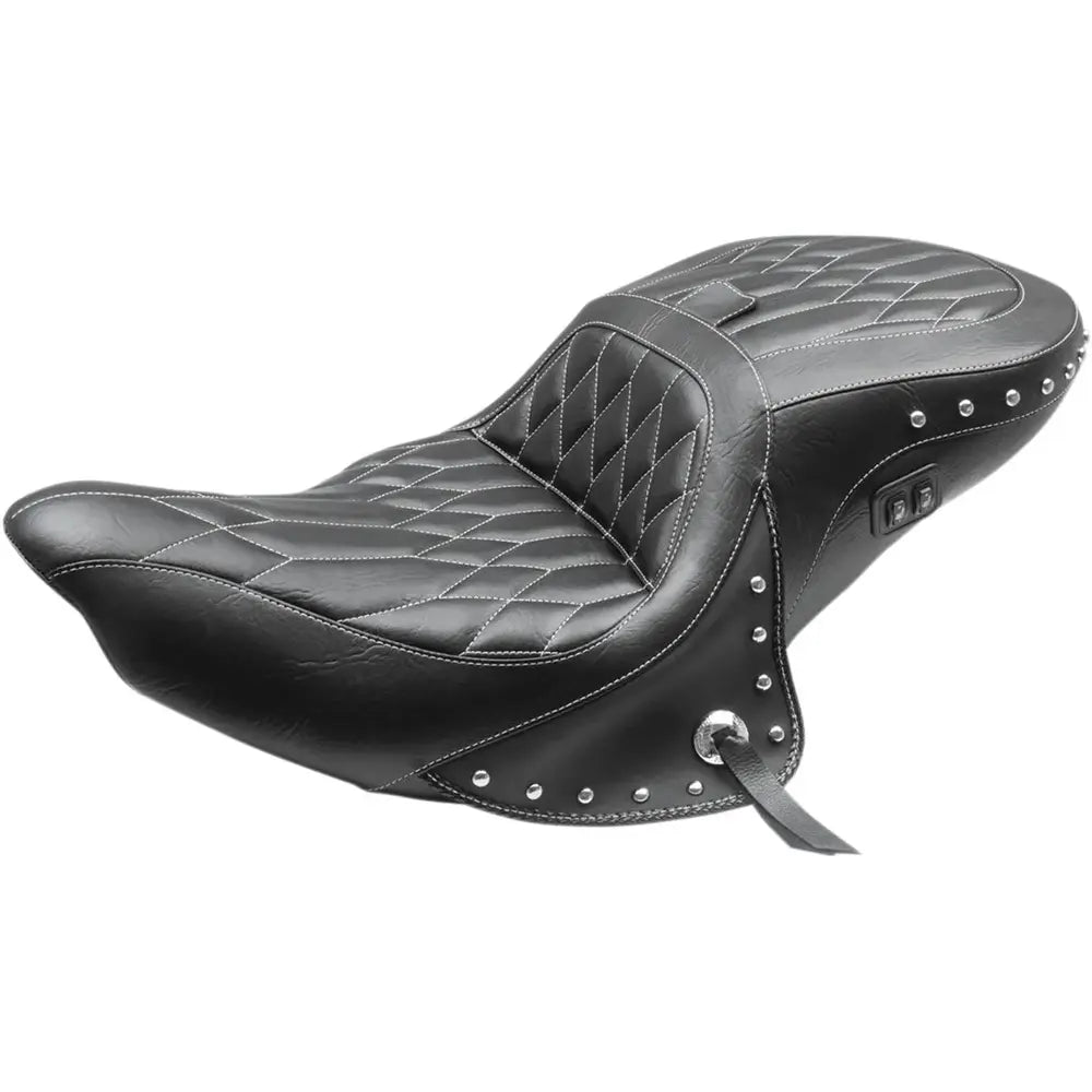 Il Standard riscaldato Touring 2-Up da Mustang trasforma la Indian Roadmaster in una vera moto da lunga distanza. Il pilota siede leggermente più in basso e più indietro rispetto alla sella di serie, creando una sensazione di guida rilassata e confortevole. Il sistema di riscaldamento a due zone integrato consente sia al pilota che al passeggero di regolare individualmente i livelli di calore utilizzando comandi discreti nascosti sotto il rivestimento con cuciture a rombi. Lo schienale incluso è regolabile, rimovibile e può essere ripiegato quando non viene utilizzato. Una sella resistente, comoda e ben progettata, costruita per percorrere molti chilometri su strada.