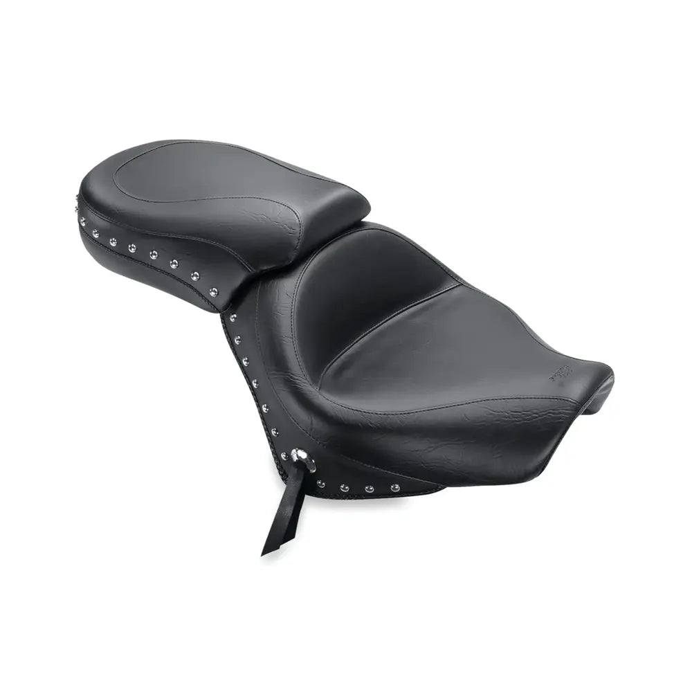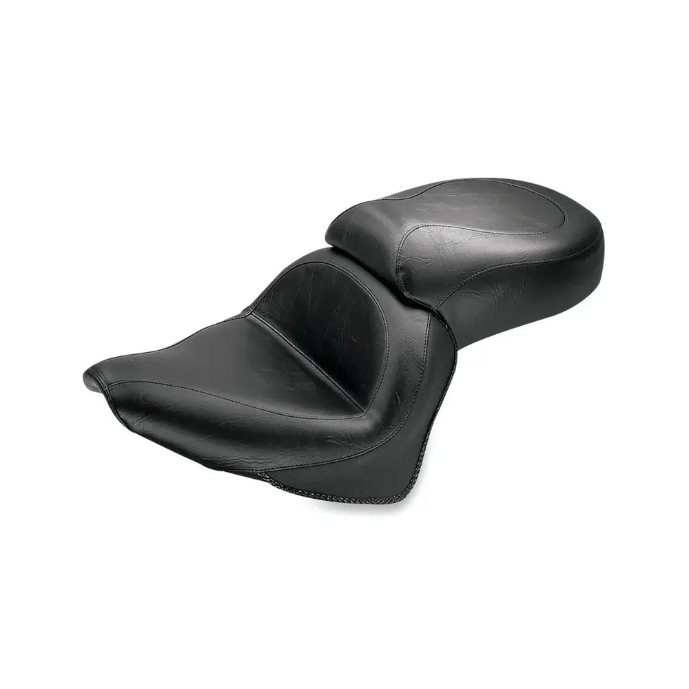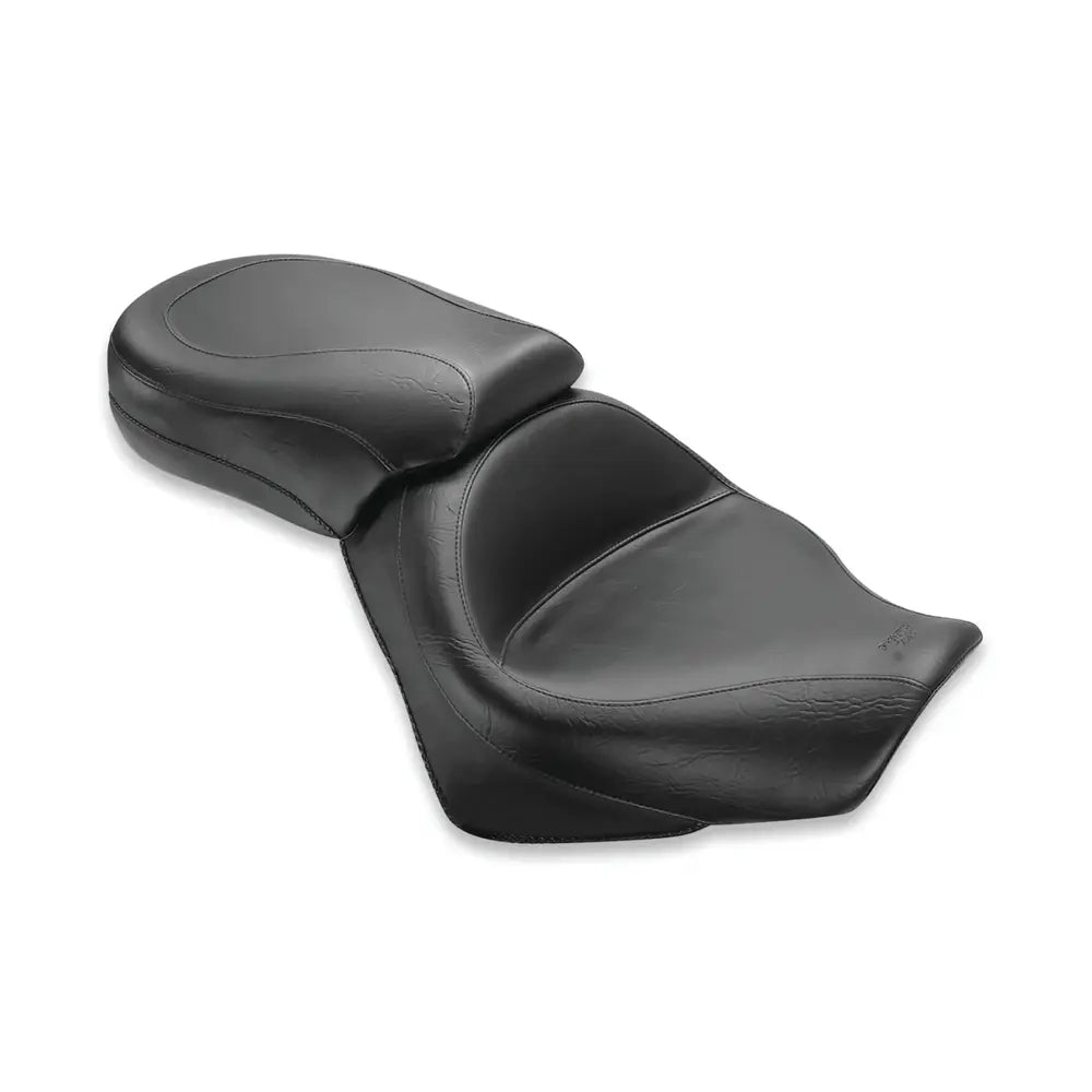 Il Wide Touring 2-Up di Mustang offre un comfort eccezionale al pilota. La sezione pilota profondamente sagomata ti mantiene saldamente in posizione in una postura di guida rilassata con un solido supporto per la schiena, mentre l'area passeggero si estende in avanti e funge da schienale integrato.