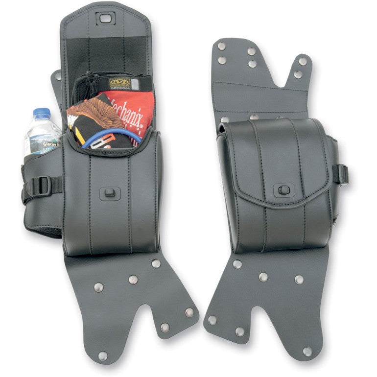 Queste borse di protezione aggiungono un pratico spazio di stivaggio ai modelli Harley Touring dotati di protezioni per borse laterali. Realizzate in SaddleHyde dello spessore di 3 mm, sono resistenti ai raggi UV e alle intemperie e hanno una struttura rigida che mantiene la forma. Ogni scomparto è dotato di cerniera e protetto da patelle antipioggia, oltre che di chiusure a quarto di giro che consentono di applicare mini lucchetti per una maggiore sicurezza. Si montano senza attrezzi, agganciandosi alle protezioni con cuscinetti antiscivolo, e includono portabevande pieghevoli in rete da utilizzare all'occorrenza.