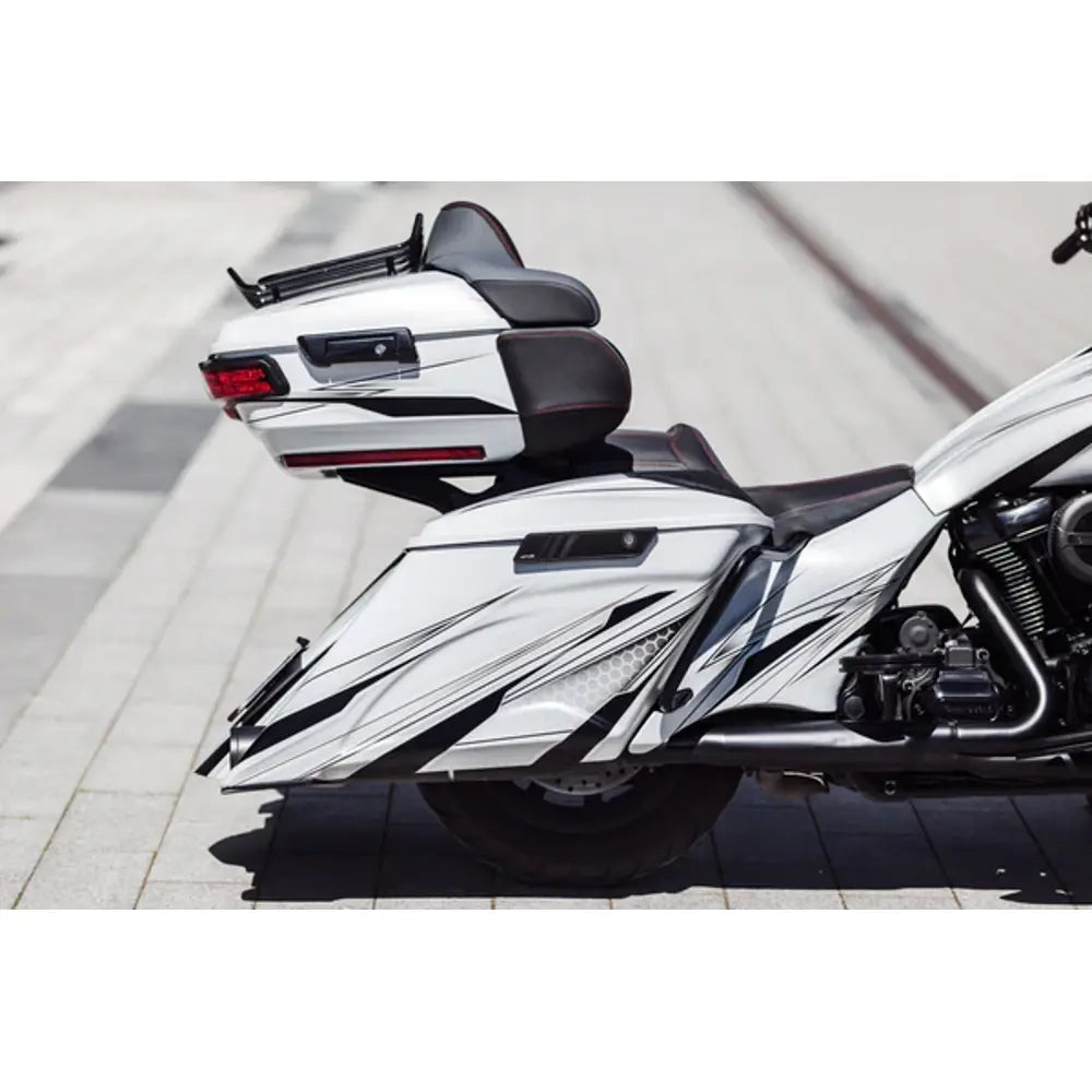 Queste borse in fibra di vetro allungate di Tommy & Sons sono state realizzate per i motociclisti Harley che desiderano un look da bagger estremo. Stampate con precisione e allungate di 7" nella parte inferiore.